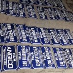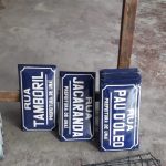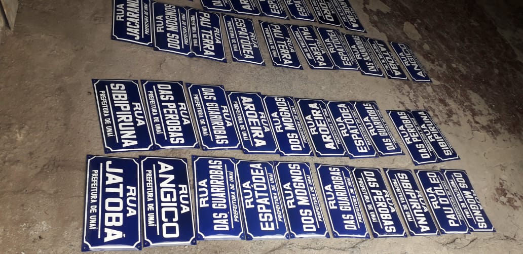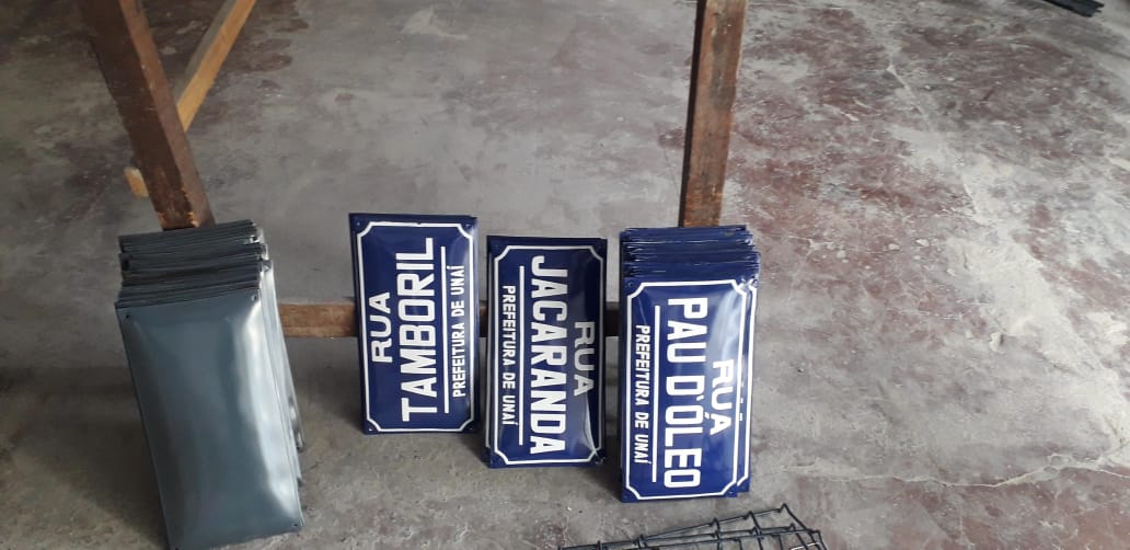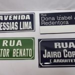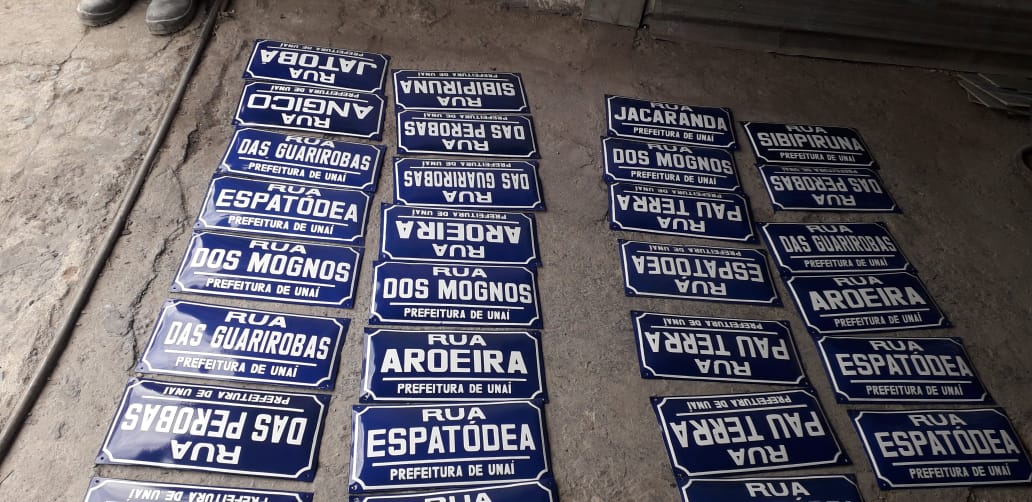 As placas esmaltadas são confeccionadas em ferro, com aplicação de esmalte, em vários tamanhos. Desenvolvemos placas sob medida de acordo com o seu projeto. As cores mais utilizadas são fundo azul marinho com letras brancas, mas possuímos outras cores à sua escolha